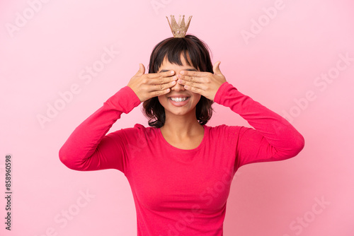 Young mixed race princess with crown isolated on pink background covering eyes by hands