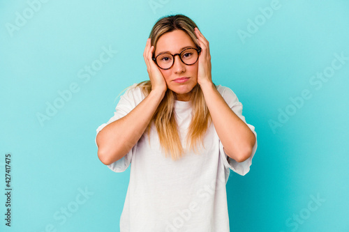 Young mixed race woman isolated on blue background crying, unhappy with something, agony and confusion concept.