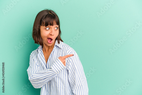 Young mixed race woman isolated on blue background looking far away keeping hand on forehead.