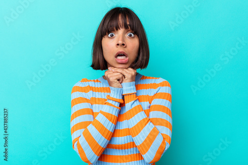 Young mixed race woman isolated on blue background praying for luck, amazed and opening mouth looking to front.