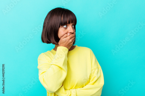 Young mixed race woman isolated on blue background thoughtful looking to a copy space covering mouth with hand.