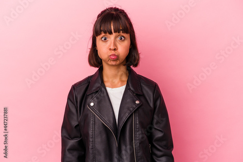 Young mixed race woman isolated on pink background blows cheeks, has tired expression. Facial expression concept.