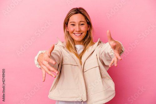 Young mixed race woman isolated on pink background feels confident giving a hug to the camera.