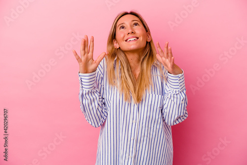 Young mixed race woman isolated on pink background laughs out loudly keeping hand on chest.