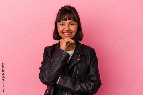 Young mixed race woman isolated on pink background smiling happy and confident, touching chin with hand.