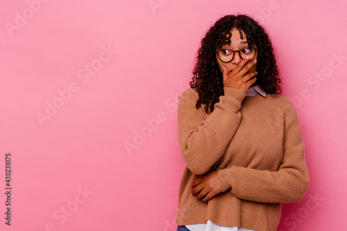 Young mixed race woman isolated on pink background thoughtful looking to a copy space covering mouth with hand.