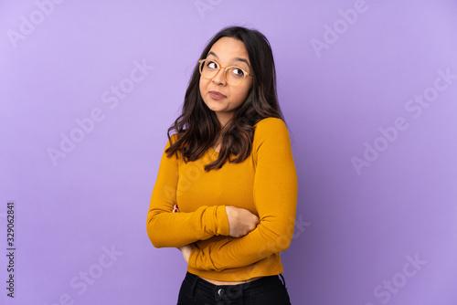 Young mixed race woman isolated on purple background making doubts gesture while lifting the shoulders
