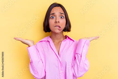 Young mixed race woman isolated on yellow background confused and doubtful shrugging shoulders to hold a copy space.