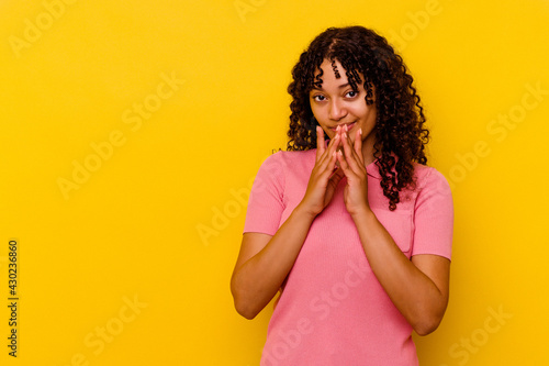 Young mixed race woman isolated on yellow background making up plan in mind, setting up an idea.