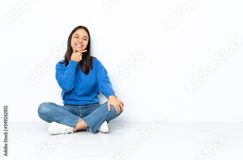 Young mixed race woman sitting on the floor isolated on white background happy and smiling