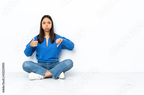 Young mixed race woman sitting on the floor isolated on white background making good-bad sign. Undecided between yes or not