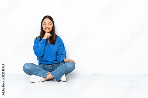 Young mixed race woman sitting on the floor isolated on white background showing a sign of silence gesture putting finger in mouth