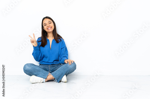 Young mixed race woman sitting on the floor isolated on white background smiling and showing victory sign