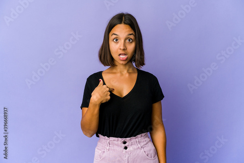 Young mixed race woman surprised pointing with finger, smiling broadly.