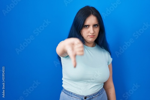 Young modern girl with blue hair standing over blue background looking unhappy and angry showing rejection and negative with thumbs down gesture. bad expression.