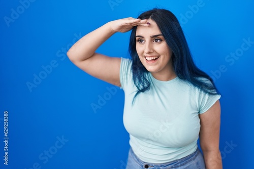 Young modern girl with blue hair standing over blue background very happy and smiling looking far away with hand over head. searching concept.