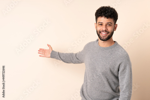 Young Moroccan man isolated on beige background extending hands to the side for inviting to come