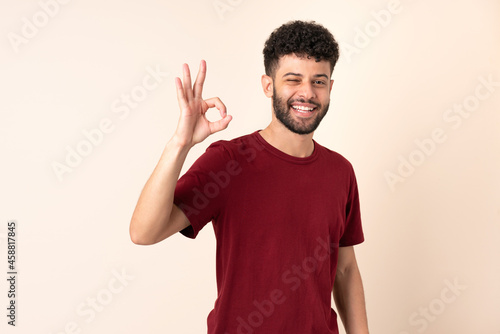 Young Moroccan man isolated on beige background showing ok sign with fingers