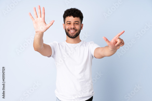 Young Moroccan man isolated on blue background counting seven with fingers