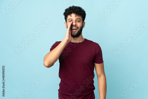 Young Moroccan man isolated on blue background shouting with mouth wide open