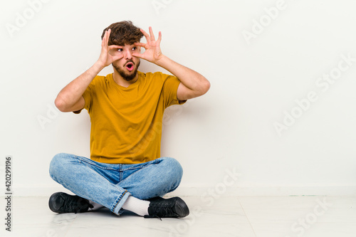 Young Moroccan man sitting on the floor isolated on white background keeping eyes opened to find a success opportunity.
