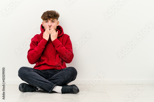 Young Moroccan man sitting on the floor isolated on white background shocked, covering mouth with hands, anxious to discover something new.
