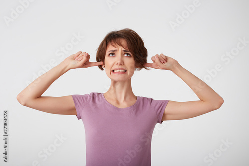 Young nice doubted short-haired lady in blank t-shirt, plugs ears as hears awful noise or music, squints face, avoids loud sound, ignores something unpleasant. Stands over white wall.