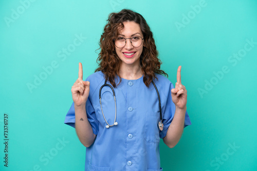 Young nurse caucasian woman isolated on blue background pointing up a great idea