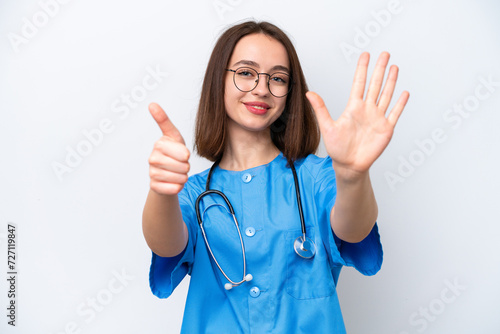 Young nurse Ukrainian woman isolated on white background counting six with fingers