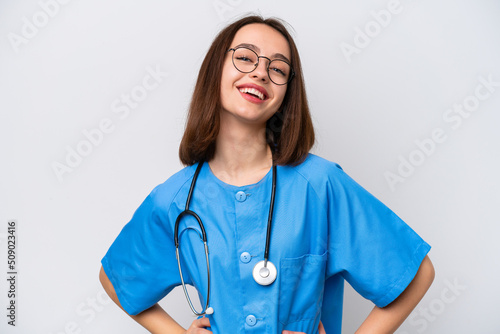 Young nurse Ukrainian woman isolated on white background posing with arms at hip and smiling
