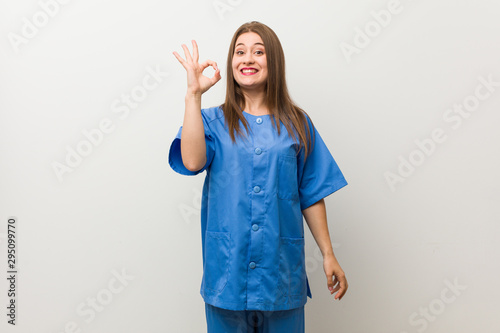 Young nurse woman against a white wall cheerful and confident showing ok gesture.