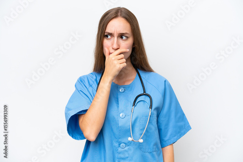 Young nurse woman over isolated on white background having doubts and with confuse face expression