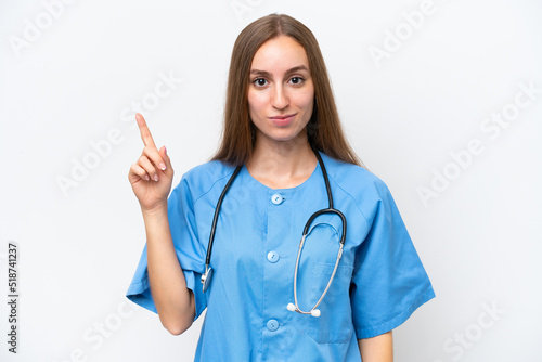 Young nurse woman over isolated on white background pointing with the index finger a great idea