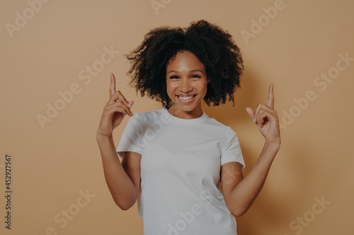 Young overjoyed dark skinned woman pointing up with forefingers, isolated on beige background