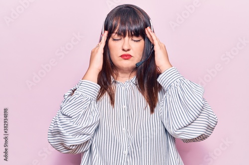 Young plus size woman wearing call center agent headset suffering from headache desperate and stressed because pain and migraine. hands on head.