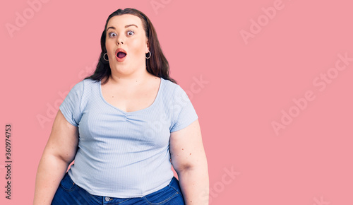 Young plus size woman wearing casual clothes afraid and shocked with surprise expression, fear and excited face.