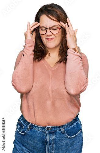 Young plus size woman wearing casual clothes and glasses with hand on head, headache because stress. suffering migraine.