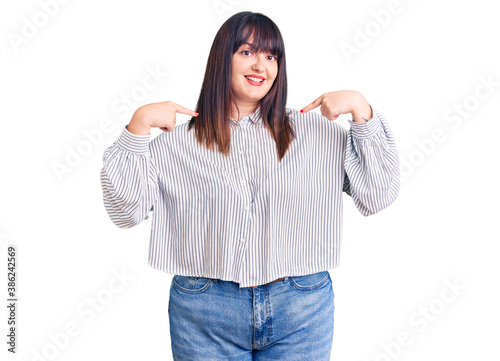 Young plus size woman wearing casual clothes looking confident with smile on face, pointing oneself with fingers proud and happy.