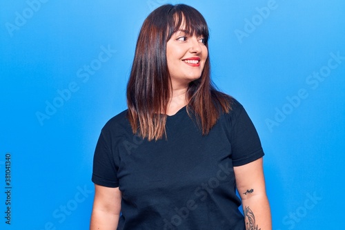 Young plus size woman wearing casual clothes looking to side, relax profile pose with natural face and confident smile.