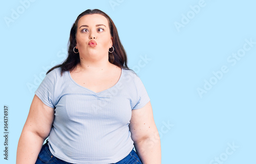 Young plus size woman wearing casual clothes making fish face with lips, crazy and comical gesture. funny expression.