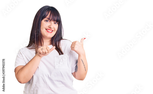 Young plus size woman wearing casual clothes pointing to the back behind with hand and thumbs up, smiling confident