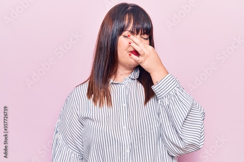 Young plus size woman wearing casual clothes smelling something stinky and disgusting, intolerable smell, holding breath with fingers on nose. bad smell
