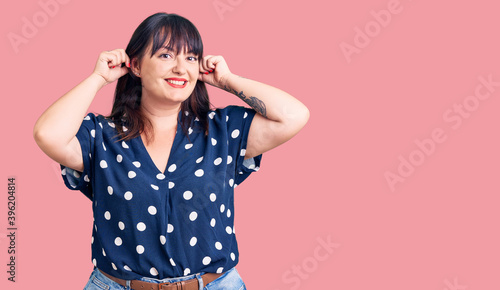 Young plus size woman wearing casual clothes smiling pulling ears with fingers, funny gesture. audition problem