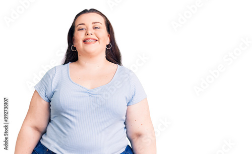 Young plus size woman wearing casual clothes with a happy and cool smile on face. lucky person.