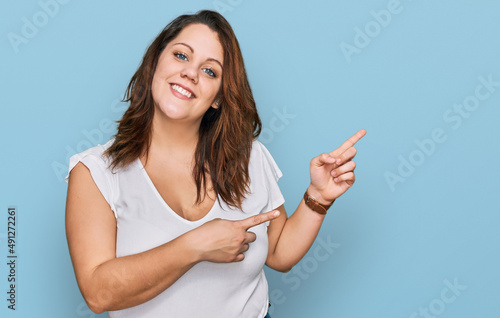 Young plus size woman wearing casual white t shirt smiling and looking at the camera pointing with two hands and fingers to the side.