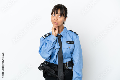 Young police mixed race woman isolated background and looking up