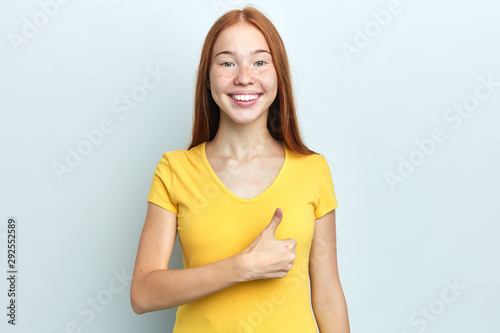 Young positive woman giving a thumbs up gesture isolated over white background, good job, happiness, body language. close up portrait