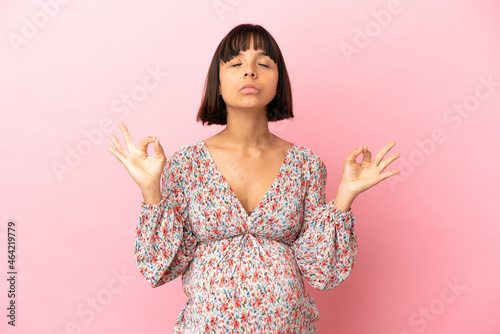 Young pregnant woman over isolated pink background in zen pose