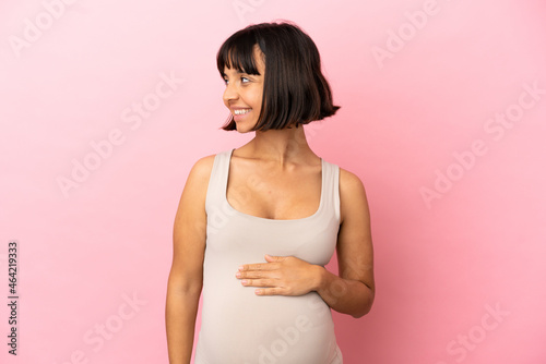 Young pregnant woman over isolated pink background looking to the side and smiling