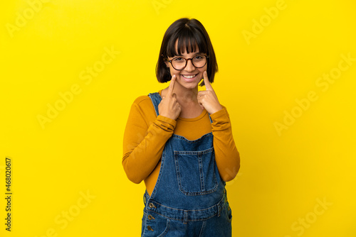 Young pregnant woman over isolated yellow background smiling with a happy and pleasant expression